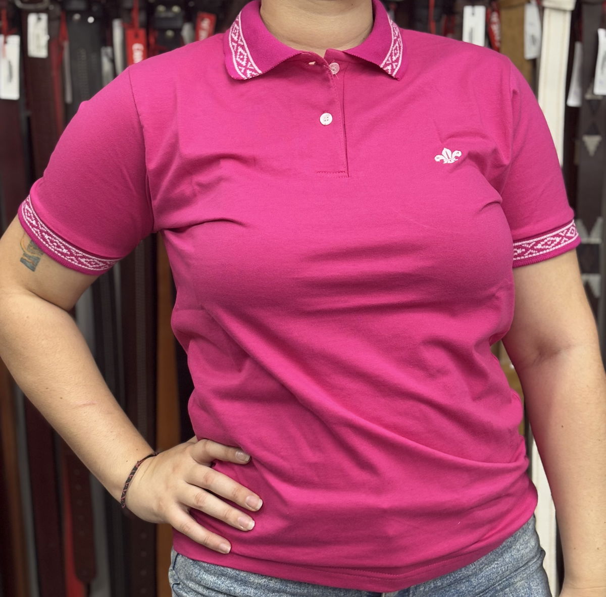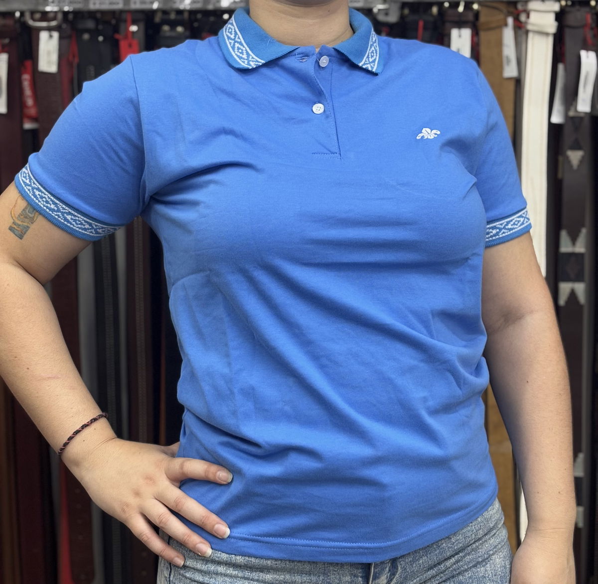 Su diseño se distingue por la guarda pampa en el cuello y en las mangas.
