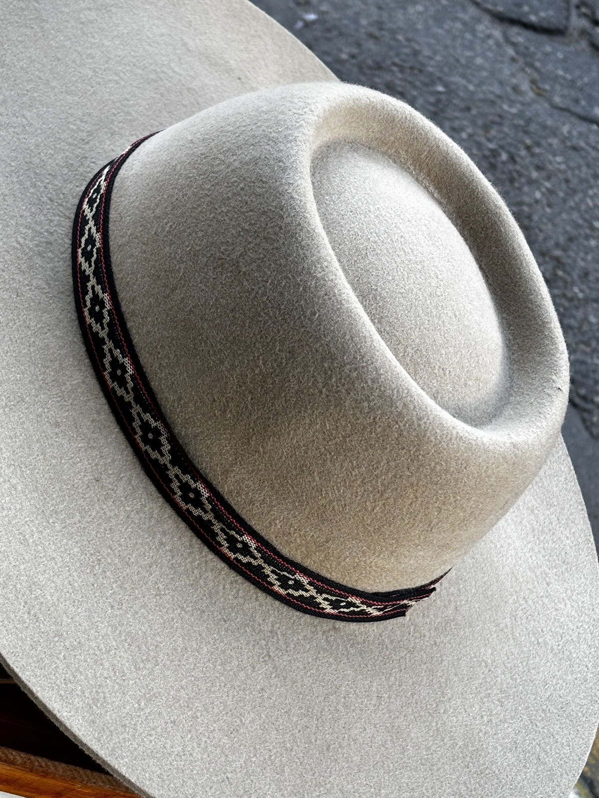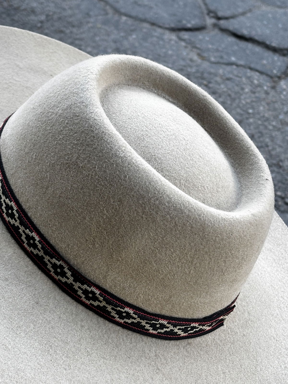 Sombrero de paño color tiza, con guarda pampa artesanal que realza su diseño. Ala ancha de 10 cm y copa firme. Perfecto para un look gaucho auténtico.