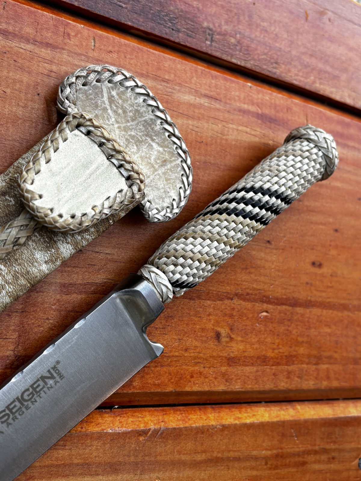 Cuchillo Seigen forjado en acero al carbono (oxidable). Su cabo está finamente trenzado en cuero crudo, lo que le otorga un estilo auténtico y firmeza al agarre.