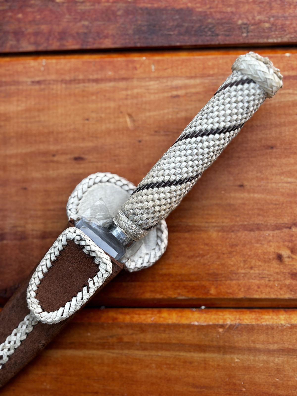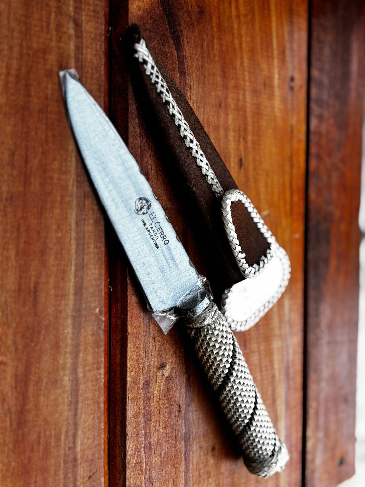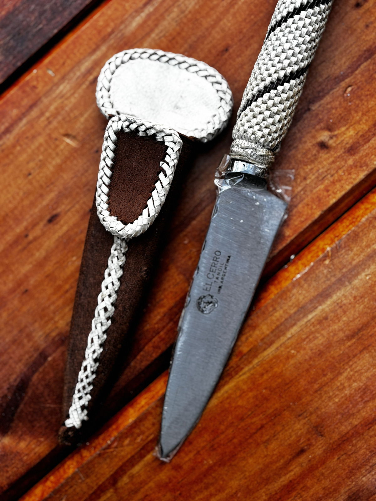 Cuchillo de acero Tandil, hoja de 12 cm, cabo trenzado en cuero crudo y vaina de cuero crudo.