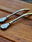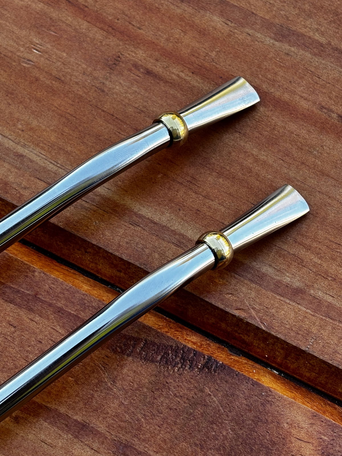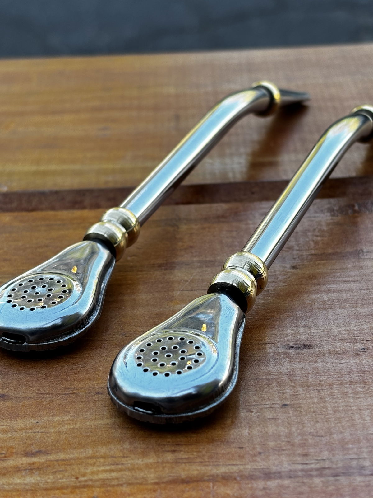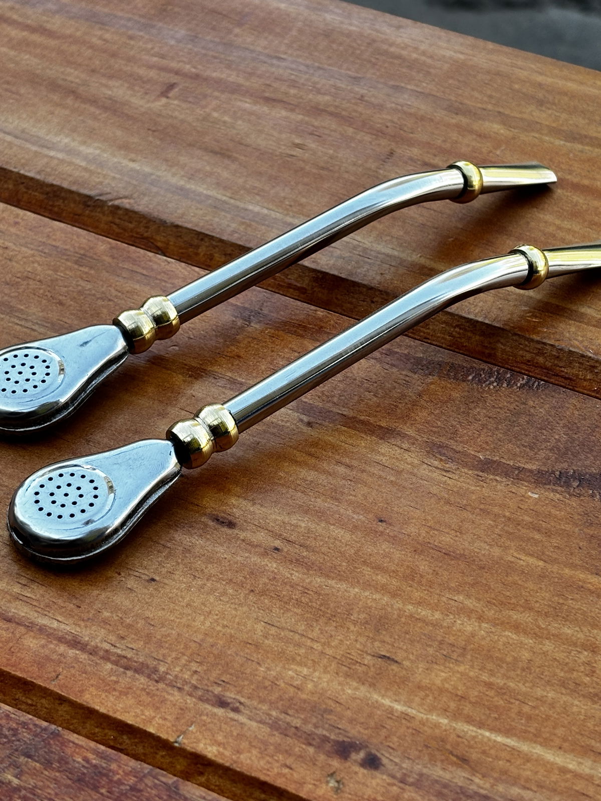 Bombilla de acero cruva, con cuchara en la parte inferior, que es desarmable. Mide alrededor de 14cm.