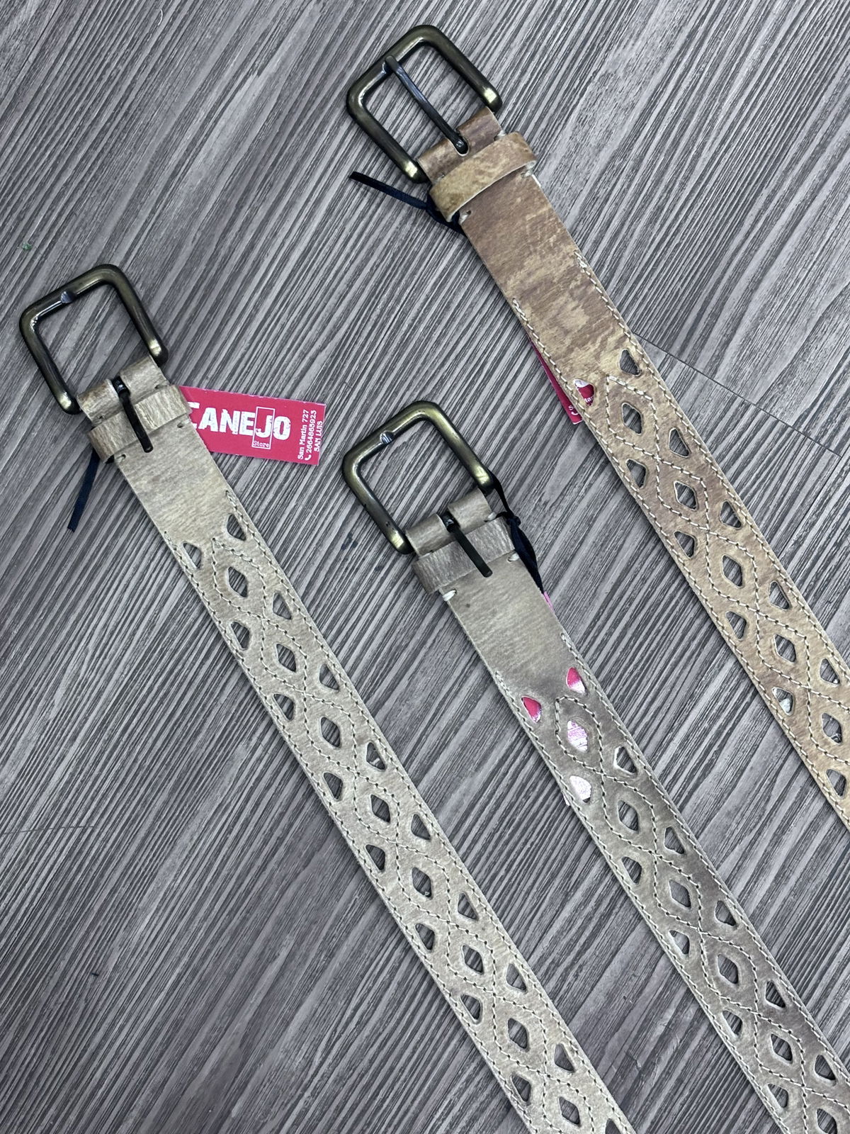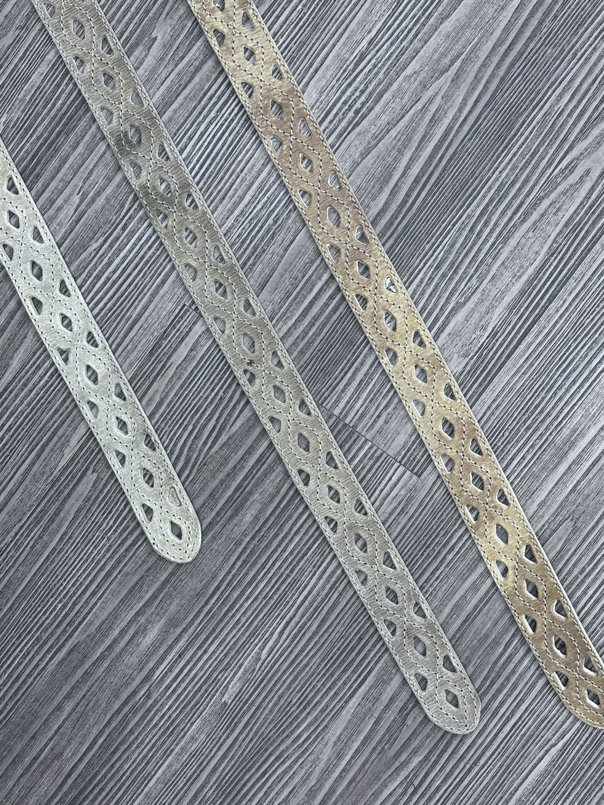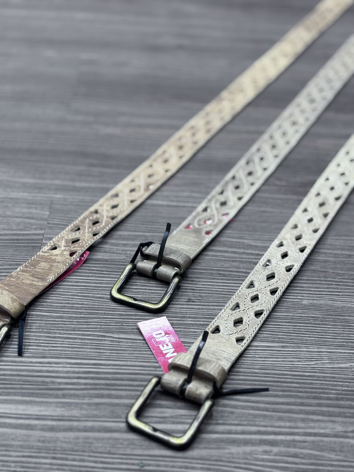 Cinto de cuero crudo afeitado y calado con orificios, y hebilla acero.